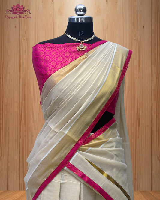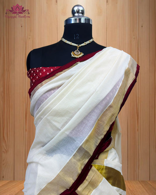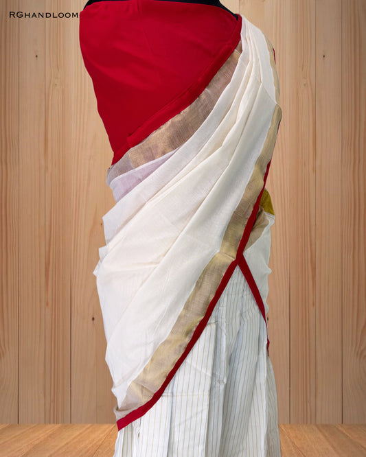 Kerala traditional dhavani set, adorned with a radiant red and golden border.